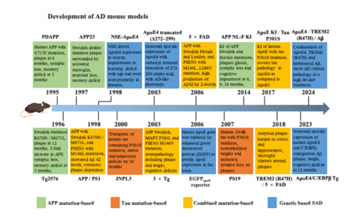 因此,为了更好地模拟生理状态下基因突变导致的病理形成,近年来科学家们逐渐构建了一系列利用基因敲入策略的AD小鼠模型,包括APP NL-F、APP NL-G-F等,以及基于这些小鼠与其他AD小鼠模型杂交形成小鼠模型。此外,基于ApoE4、TREM2等与散发性AD形成相关风险因素小鼠模型的构建也引发关注,例如在神经元中特异性过表达ApoE4,以及TREM2(R47H)基因的敲入等。