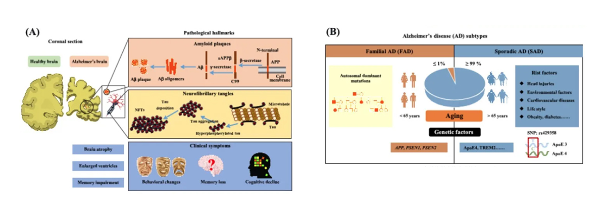 根据发生类型的不同,AD分为散发性和家族性两类。其中,散发性AD病人占比超过99%,主要由多种因素协同导致,而载脂蛋白ApoE4基因是最强的遗传风险因子;与相比,家族性AD只占极少部分(不到1%),主要由遗传突变因素控制,包括编码β淀粉样蛋白前体蛋白(Amyloid precursor protein,APP)、早老素1和2(Presenilin,PS1/2)等基因的突变导致。