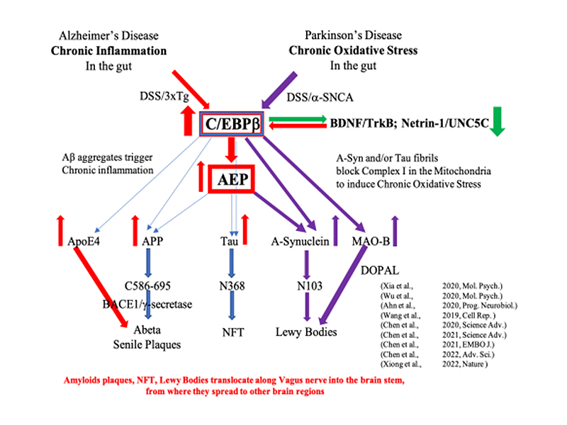 Ye lab discovered that C/EBPβ, an age-dependent transcription factor, serves as a master regulator of multiple core pathogenic genes implicated in Alzheimer’s disease (AD), including APP, Tau, and ApoE4. C/EBPβ mediates the transcriptional activation of δ-secretase (AEP), which proteolytically processes APP into fragments that potently amplify β-secretase activity, thereby exacerbating β-amyloid (Aβ) generation. Simultaneously, AEP-mediated proteolytic cleavage of Tau precipitates its pathological aggregation, fostering neurofibrillary tangle formation and unveiling a previously unrecognized axis in AD pathogenesis. In addition, AEP cleaves α-synuclein (α-Syn) at the N103 residue, yielding a highly aggregation-prone and neurotoxic α-Syn N103 fragment that drives dopaminergic neurodegeneration and motor deficits. Capitalizing on these mechanistic insights, Ye lab rationally developed a Single-Molecule Array (SiMoA) technology for ultrasensitive detection of AEP-generated proteolytic fragments in blood as early diagnostic biomarkers for AD and PD. Ye lab also designed CP#11A, a potent and selective small-molecule AEP inhibitor. Remarkably, CP#11A not only mitigates AD and PD pathology in preclinical models but also exhibits potential anti-aging properties, demonstrate tremendous clinical translational potential for addressing age-related neurodegenerative disorders.